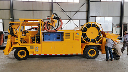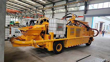5.在正常噴射施工中,電動(dòng)機(jī)驅(qū)動(dòng)它馳騁在工地上。即便在電力中斷的情況下,柴油機(jī)也能短暫地驅(qū)動(dòng)泵送系統(tǒng),讓噴射機(jī)械手以較慢的速度進(jìn)行各種操作,確保施工的連續(xù)性。